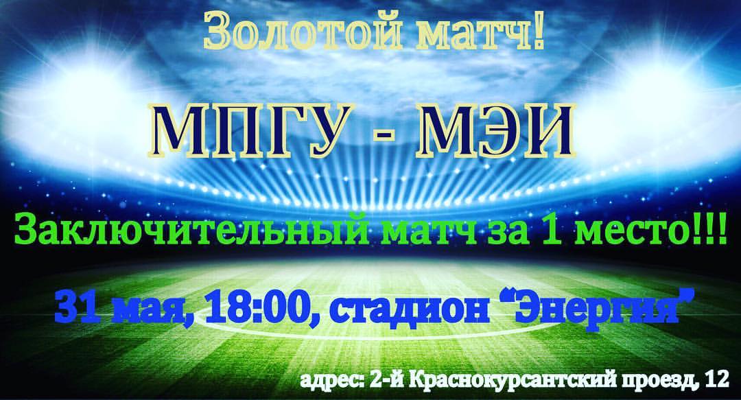 31 мая на стадионе «Энергия» состоится матч за 1 место в Московской студенческой футбольной лиги. В финальном матч этого сезона встретятся команды Московского педагогического государственного университета (МПГУ) и Московского энергетического института (МЭИ).