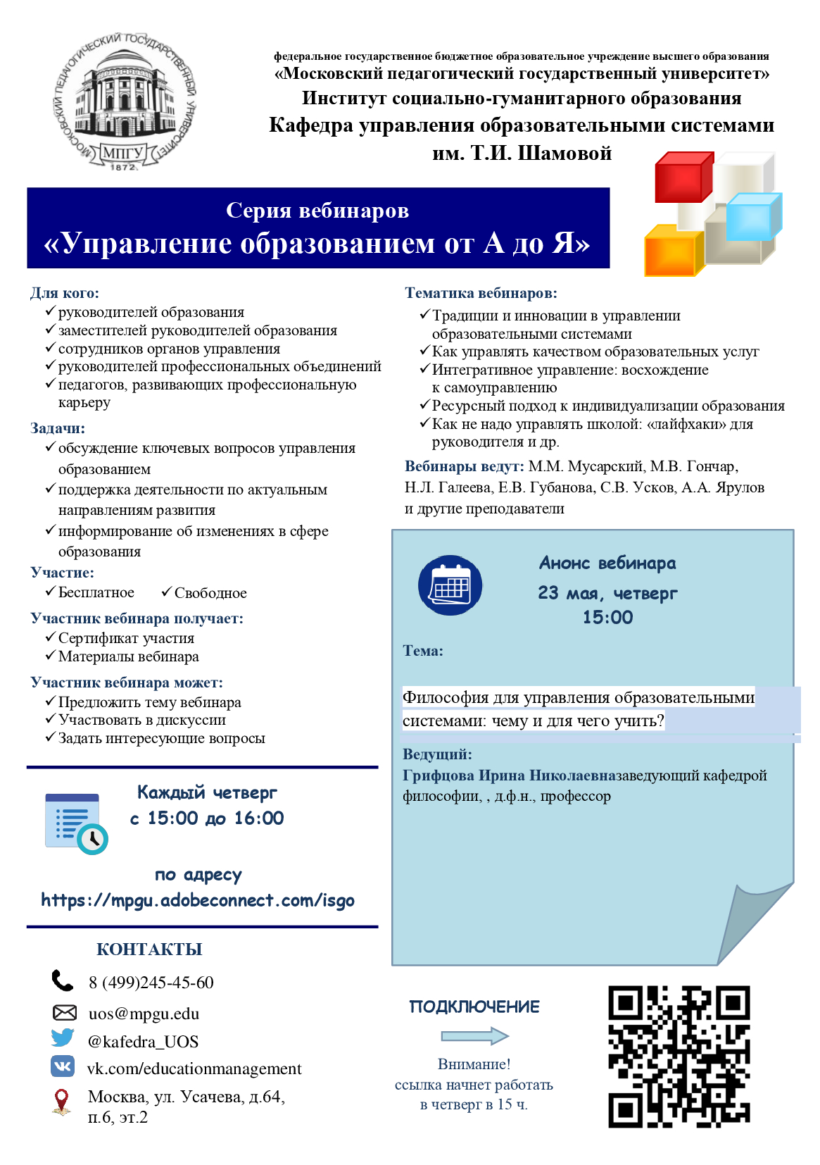 23 мая 2019 г. в 15.00 состоится вебинар в рамках серии «Управление образование от А до Я» с заведующей кафедрой философии Института социально-гуманитарного образования Грифцовой И.Н.