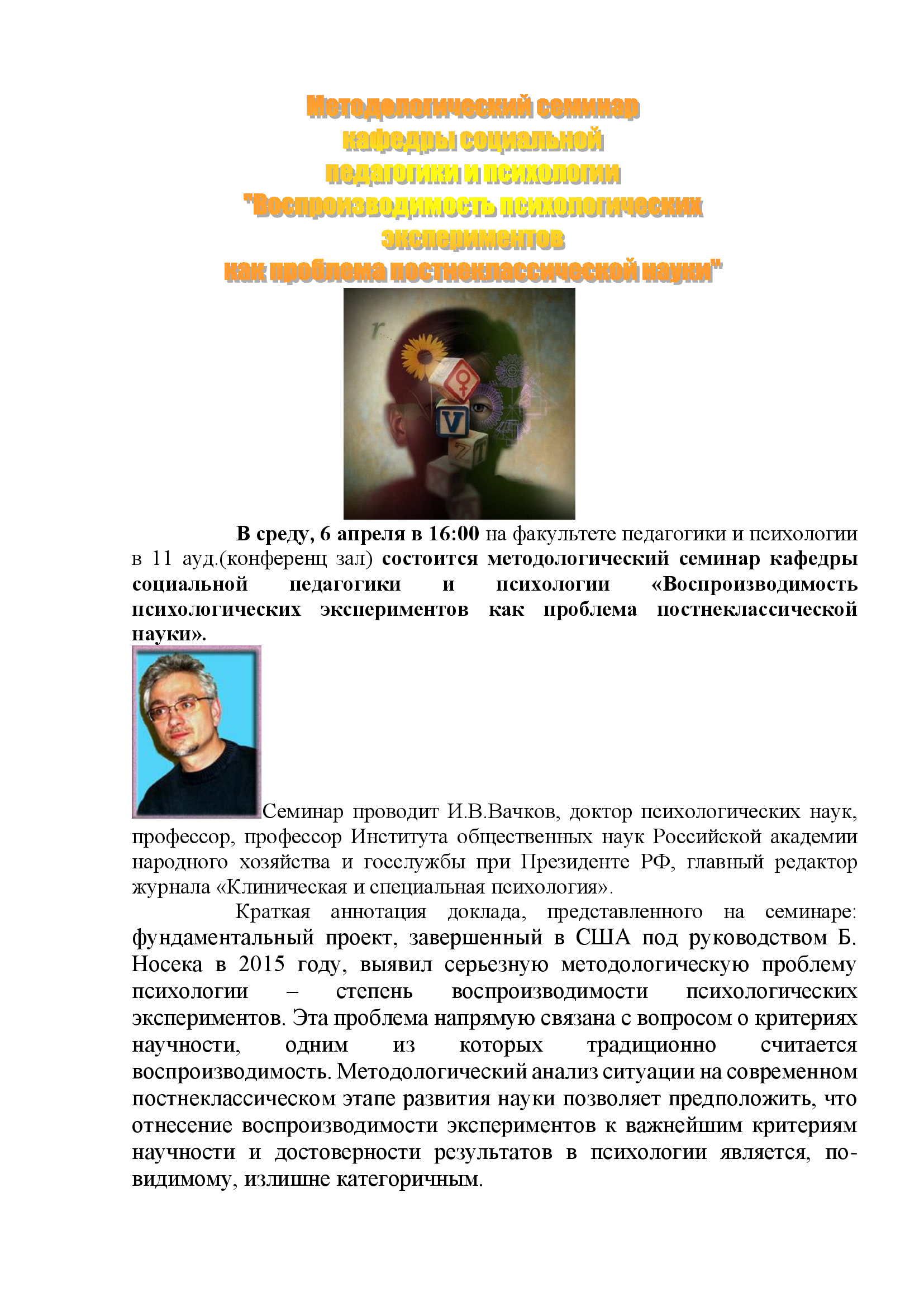 В среду, 6 апреля в 16:00 на факультете педагогики и психологии в 11 ауд.(конференц зал) состоится методологический семинар кафедры социальной педагогики и психологии «Воспроизводимость психологических экспериментов как проблема постнеклассической науки».