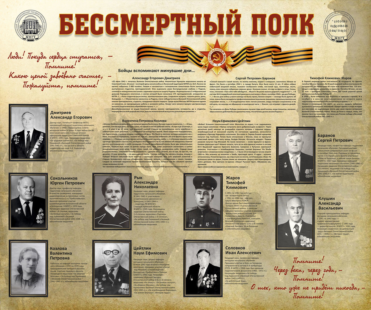 Здесь Александр Егорович Дмитриев – артиллерист и политработник, многие годы возглавлявший Совет Ветеранов МПГУ. Здесь и другие преподаватели факультета, которых объединили фронтовые дороги: сын полка, участник боевых сражений в Польше, Венгрии, Австрии — Сергей Петрович Баранов, разведчик и связист Юрген Петрович Сокольников, солдат Красной Армии Иван Алексеевич Соловков, боец морской пехоты Тимофей Климович Жаров. Здесь и труженики тыла – Козлова Валентина Петровна, Александр Васильевич Клушин, самоотверженным трудом приближающие победу.