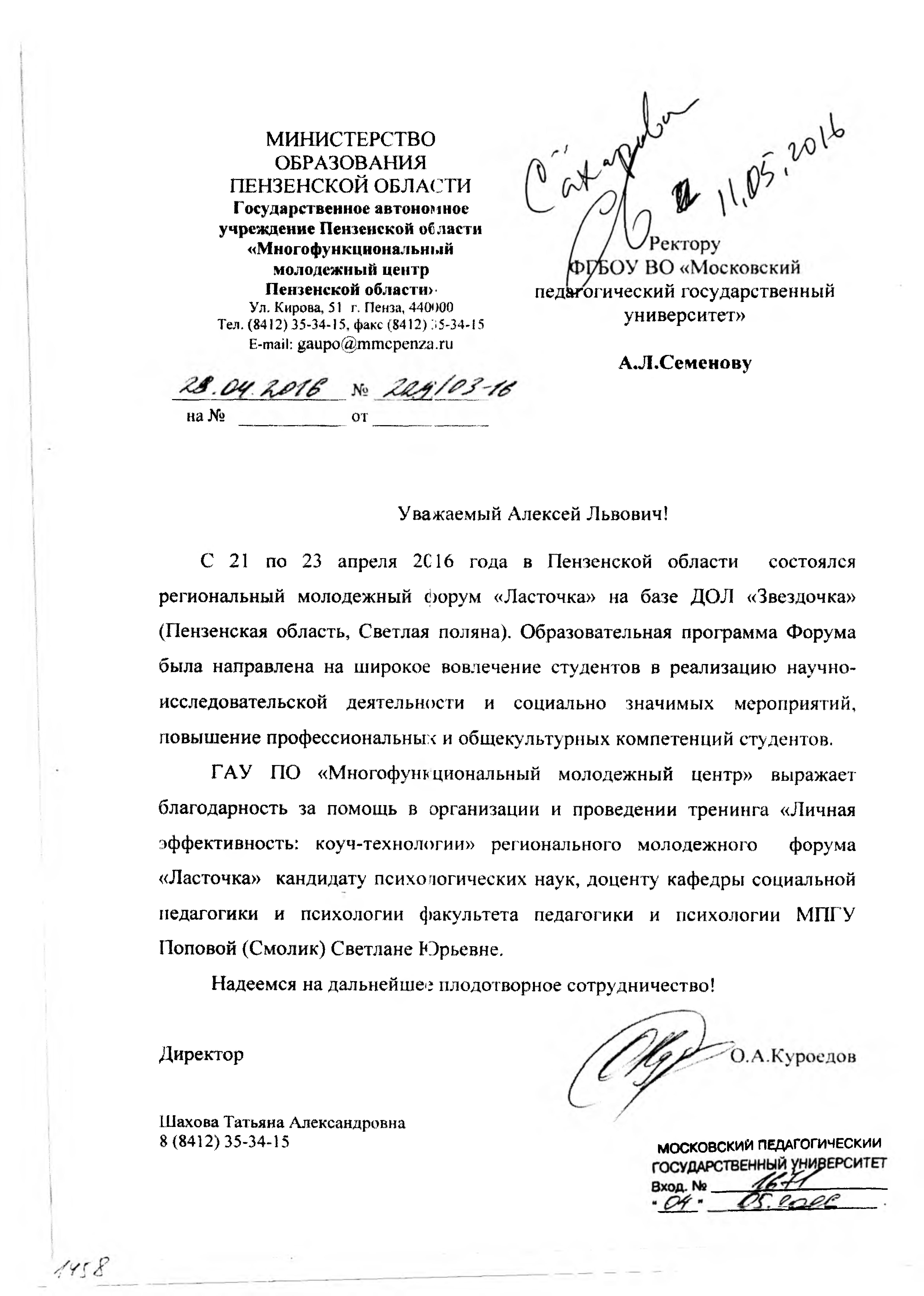 ГАУ ПО «Многофункциональный молодежный центр» выражает благодарность за помощь в организации и проведении тренинга «Личная эффективность: коуч-технологии» регионального молодежного форума «Ласточка» кандидату психологических наук, доценту кафедры социальной педагогики и психологии факультета педагогики и психологии МПГУ Поповой (Смолик) Светлане Юрьевне.