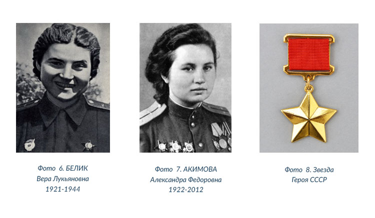 Боевые подвиги героини отмечены многими наградами: Акимова удостоена звания Героя Советского Союза. Посмертно это звание присвоено студентке МГПИ им. К. Либкнехта В.Л. Белик, служившей в полку штурманом.