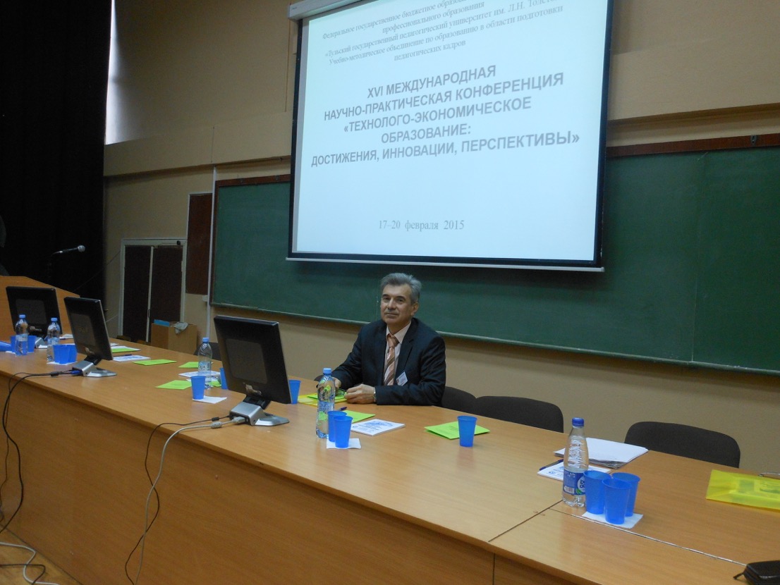С 17 по 20 февраля 2015 года в Тульском государственном педагогическом университете им. Л.Н. Толстого состоялась XVI Международная научно-практическая конференция «Технолого-экономическое образование: достижения, инновации, перспективы», посвященная современным проблемам развития технолого-педагогического образования в нашей стране и стран ближнего зарубежья. На конференцию приехали представители 12 регионов нашей страны и соседних государств. Участниками конференции, в числе которых была и делегация преподавателей Института физики, технологии и информационных систем от кафедры технологии и профессионального обучения, обсуждался широкий круг вопросов, связанных с перспективами непрерывного технологического образования, с современными подходами к реализации сетевой формы образовательных программ при подготовке бакалавров и магистров педагогического образования. С докладом «Технологическое образование в России в 2014-2015 годах» выступил доктор физико-математических наук, профессор кафедры технологии и профессионального обучения Хотунцев Юрий Леонтьевич.